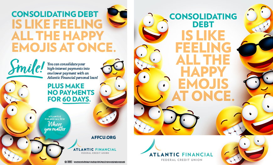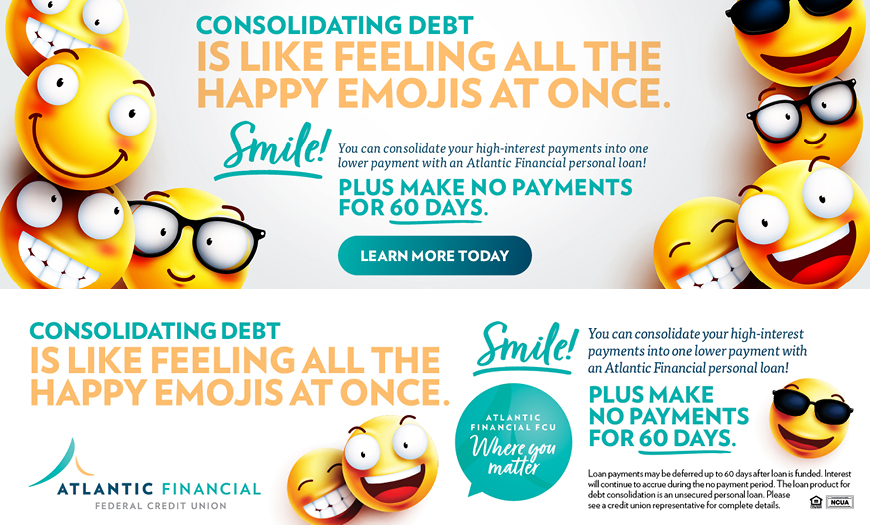 Debt is a pain point for many. When Atlantic Financial wanted to a promote its personal loans and no payments for 60 days as a smart debt-consolidation solution, MarketMatch took a creative approach that we hoped would put a smile on members’ faces. Emojis are a part, literally, of everyday communications between people. Using the ubiquitous smile emojis as the visual centerpiece, we developed a full digital campaign to create a positive feeling about reducing debt by consolidating with an Atlantic Financial personal loan.