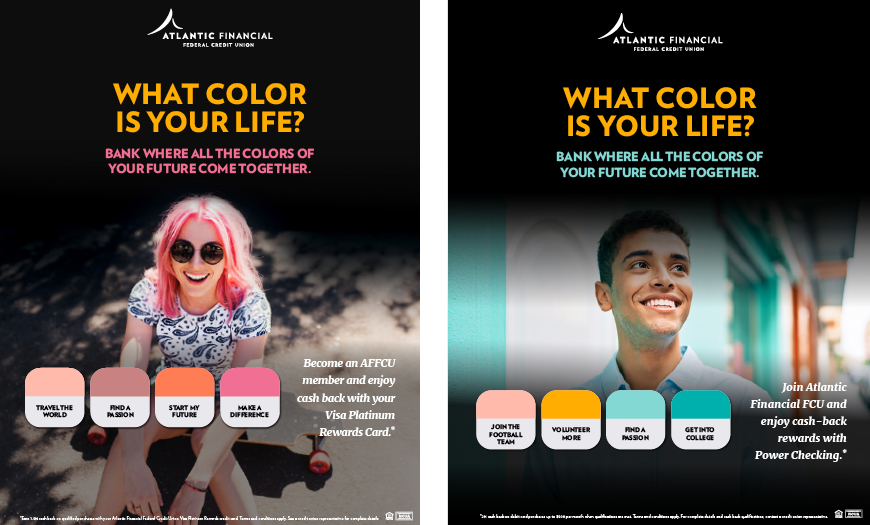 What Color is Your Life? That’s the question posed in Atlantic Financial’s recent member acquisition campaign. Targeted toward younger demographics, the credit union wanted MarketMatch to create a breakthrough campaign that featured young people pondering their future while positioning Atlantic Financial as the partner who understands them and can help them on their financial journey. We carefully selected imagery that had a more candid feel, instead of the usual staged stock. Also, central to this execution is the use of pantone color chips, each keyed to an aspirational step or goal. Rooting the campaign in the language and visuals of self-expression and creativity (the pantone chips), the campaign resonated with the intended audience and brought fresh eyes to the credit union’s brand.