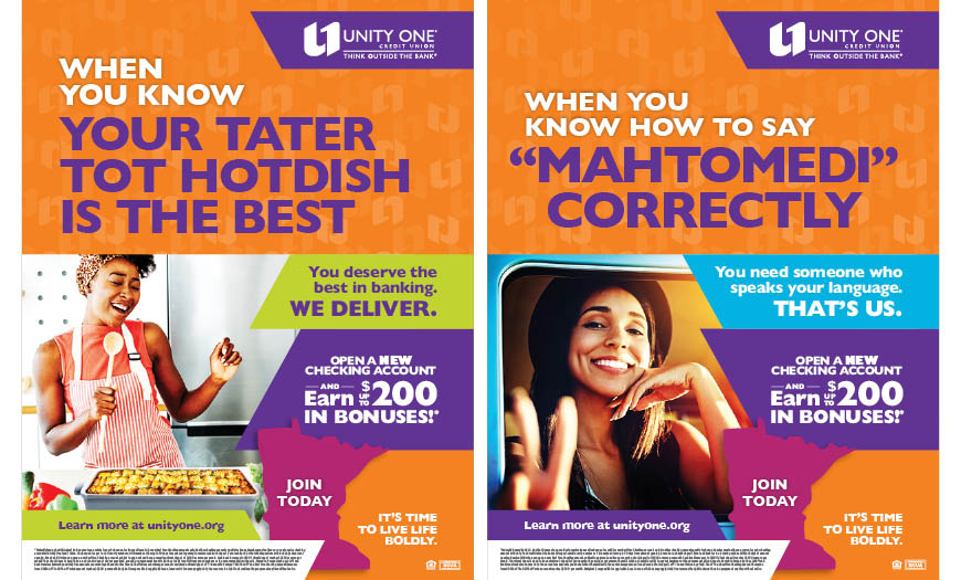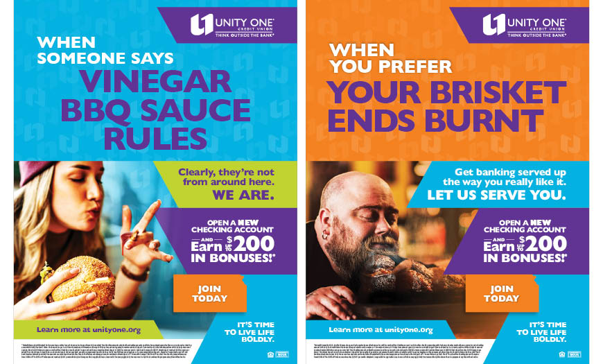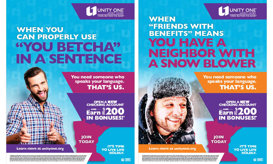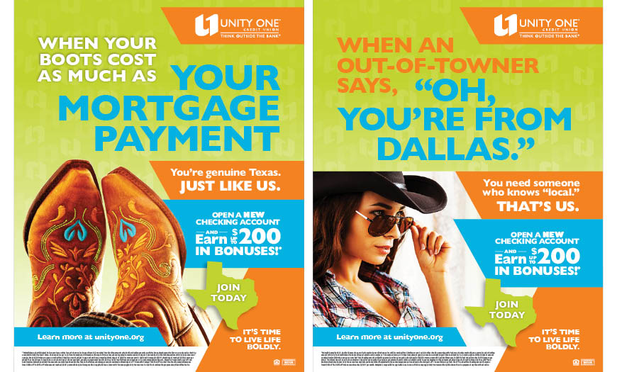 A defining tenet of Unity One’s brand is its bold personality. With this member acquisition campaign, bold took center stage. Based on a kind of “location joke” message strategy, the campaign was centered on humorous, market-specific headlines that only an insider would get or know. This was used to position Unity One as being a trusted, local financial partner, a strong differentiator versus the big chain banks. Different creative was developed around Unity One’s three markets: Texas, Kansas City, and Minnesota. MarketMatch performed market research and conducted staff interviews that turned into insights—inside jokes if you will—that would resonate with those in each community.